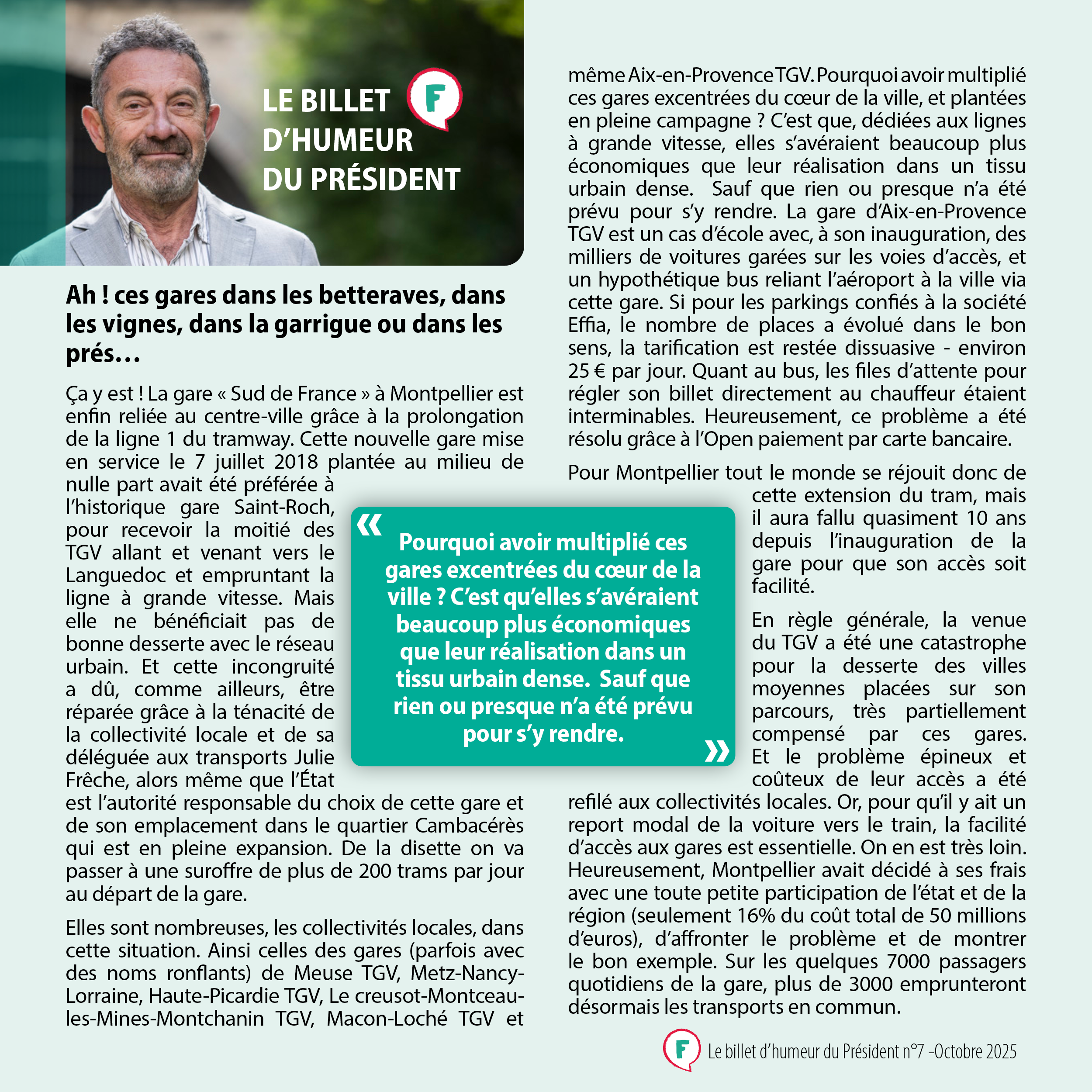 Alors que les débats sur les transports s’intensifient, entre transition écologique, infrastructures vieillissantes et flambée des coûts, la question de la mobilité n’a jamais été aussi cruciale. François Delétraz, président de la Fnaut, livre chaque mois dans son « billet d’humeur », son regard incisif sur les défis et contradictions qui façonnent notre avenir en matière de déplacements. Ce mois-ci, c’est la prolongation de la ligne 1 du tramway à Montpellier, reliant enfin la gare « Sud de France » au centre-ville, qui l’a inspiré.