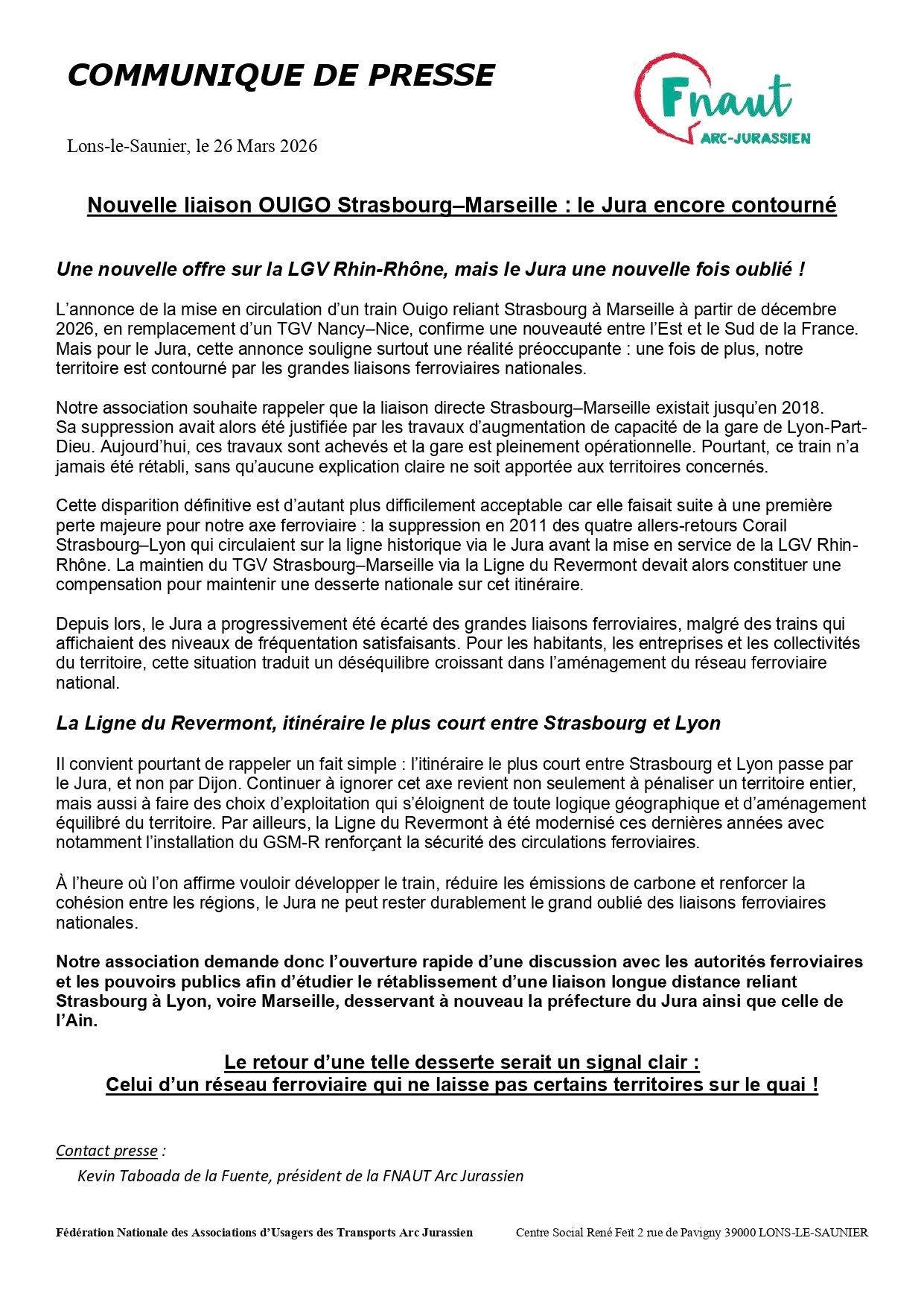 L’annonce de la mise en circulation d’un train Ouigo reliant Strasbourg à Marseille à partir de décembre 2026, en remplacement d’un TGV Nancy–Nice, confirme une nouveauté entre l’Est et le Sud de la France. Mais pour le Jura, cette annonce souligne surtout une réalité préoccupante : une fois de plus, notre territoire est contourné par les grandes liaisons ferroviaires nationales.