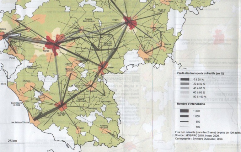 Deux études récentes (2024-2025) montrent leur importance via la Roche-sur-Yon et Cholet. La première (Université G. Eiffel) ci-dessous, reporte les seuls déplacements domicile travail interurbains entre les aires d’attraction des villes de 50 000 à 700 000 hab. Elle note que pour la Région « la part des transports collectifs (6%) y est particulièrement faible. »