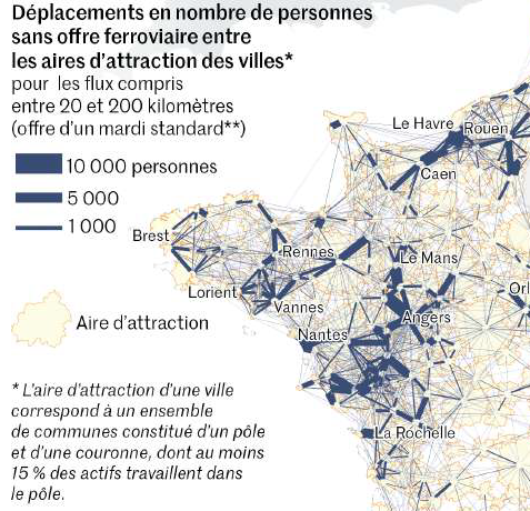 La seconde (Geonexio / Transdev) basée sur les traces téléphoniques évalue les déplacements tous motifs, qui ne peuvent bénéficier d’une offre ferroviaire.Elle note qu’apparaît « une galaxie unique en France : Saint-Nazaire, Nantes, Angers, Cholet, et la Roche-sur-Yon avec des échanges très denses et trop peu de transports collectifs. »